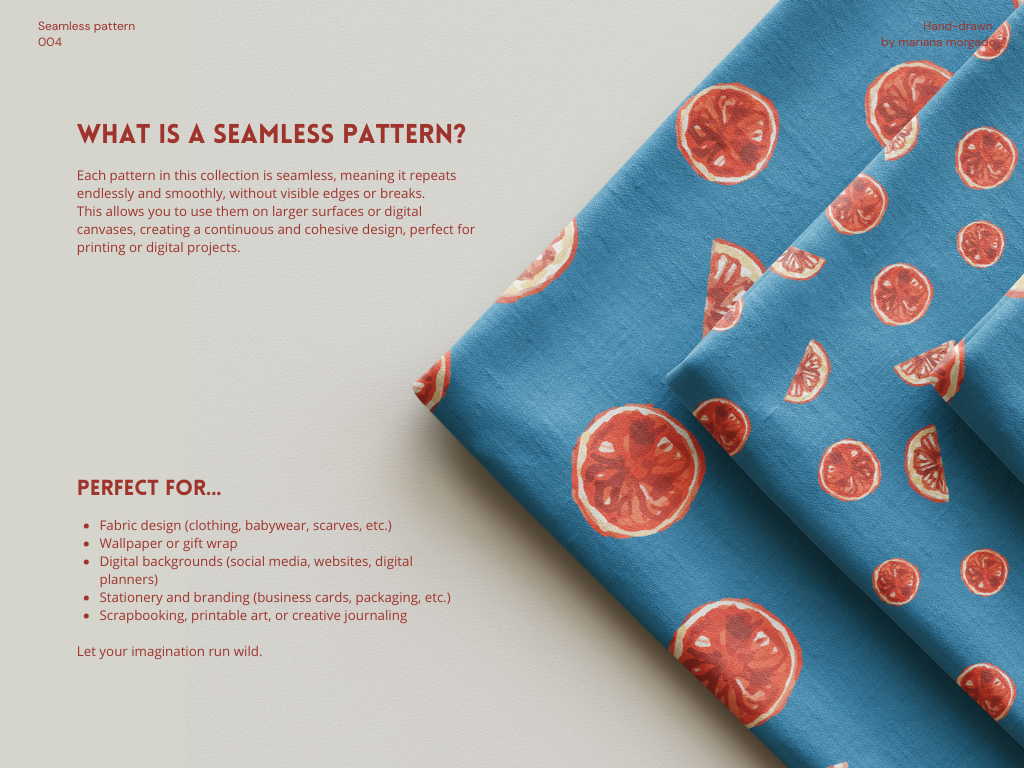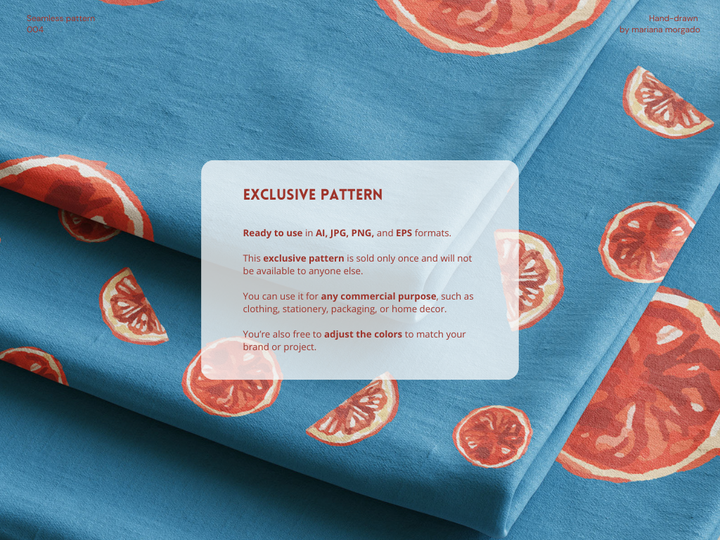 The pattern includes an unlimited commercial license, so you can use it freely across as many products as you like. You can also edit and adjust the colors to fit your brand’s identity or request color changes to make the design even more personal.